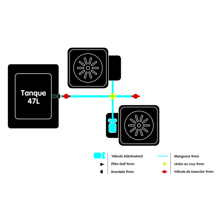 ¿Vas a cultivar más de 6 plantas? Aumenta el tamaño de tu depósito de agua y manguera y usa uniones en cruz y en T de 16/9mm para conectar tu AQUAvalve5 a la manguera principal de 16mm.