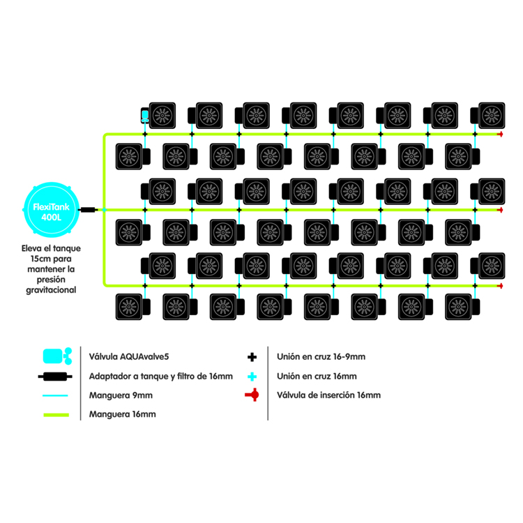 ¿Vas a cultivar más de 6 plantas? Aumenta el tamaño de tu depósito de agua y manguera y usa uniones en cruz y en T de 16/9mm para conectar tu AQUAvalve5 a la manguera principal de 16mm.