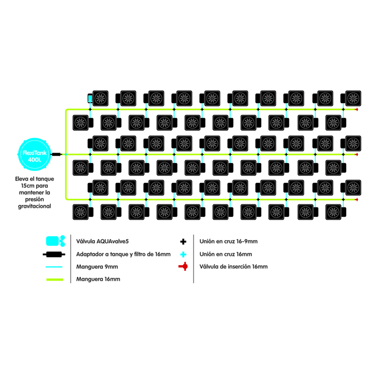 ¿Vas a cultivar más de 6 plantas? Aumenta el tamaño de tu depósito de agua y manguera y usa uniones en cruz y en T de 16/9mm para conectar tu AQUAvalve5 a la manguera principal de 16mm.